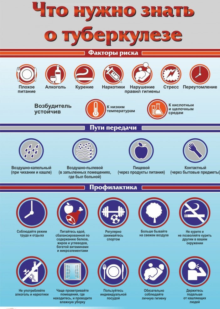Чтобы обезопасить себя и своих близких от туберкулезной инфекции, необходимо помнить о соблюдении ряда правил. Во-первых, вовремя прививаться. Об этом не стоит забывать и при воспитании собственных детей. Во-вторых, своевременно проходить флюорографию. В-третьих, следить за регулярностью и сбалансированностью режима питания, давать организму ежедневные физические нагрузки, по возможности отказаться от вредных привычек, избегать стрессовых ситуаций.